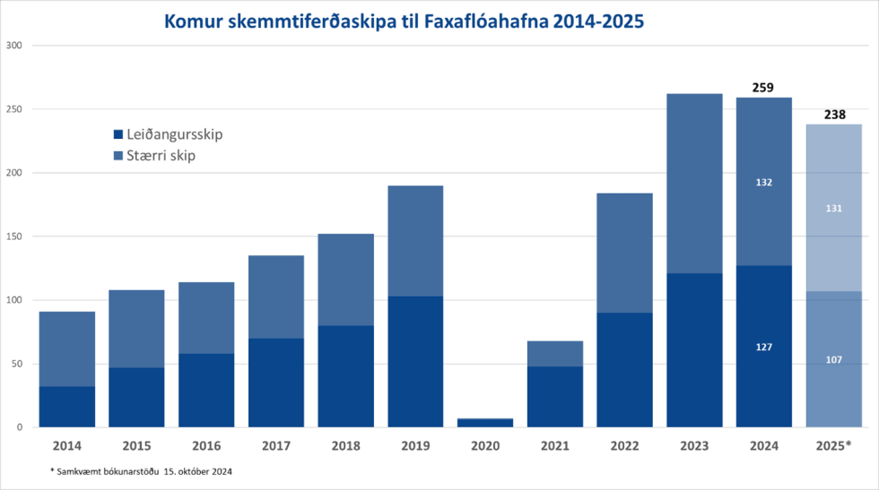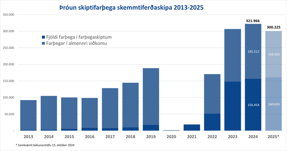 Samkvæmt bókunarstöðu skemmtiferðaskipa fyrir árið 2025 er gert ráð fyrir 238 skipakomum og um 300 þúsund farþega. Það er helst fækkun í komum leiðangursskipa sem fara úr 127 komum í 107 komur sem skýra að einhverju leiti þessa fækkun. Heildarfjöldi farþega er áætlaður 300.225 fyrir árið 2025 og þar af verði 160.633 skiptifarþegar eða um 53,5% af öllum farþegum.