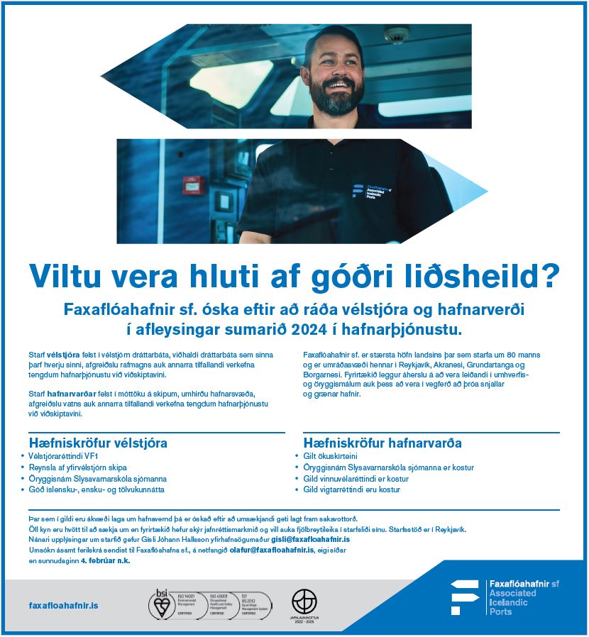 16. janúar 2024Viltu vera hluti af góðri liðsheild ?Faxaflóahafnir óska eftir að ráða vélstjóra og hafnarverði í afleysingar sumarið 2024 í hafnarþjónustu.